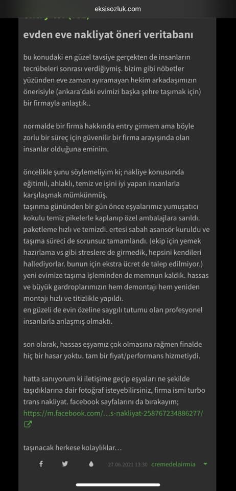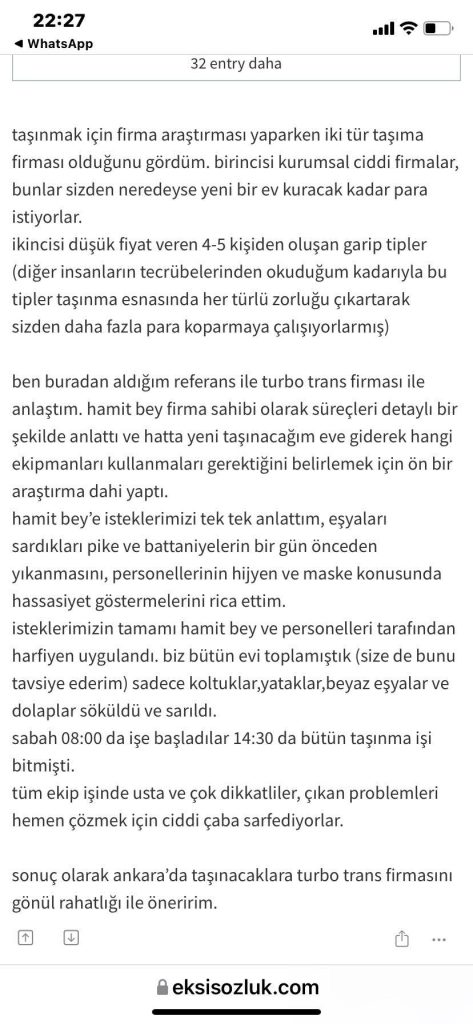 Turbotrans Nakliyat ile taşınma süreci hiç bu kadar kolay olmamıştı. Eşyalarımı özenle paketlediler ve yeni evime sorunsuz bir şekilde taşıdılar. İşlerindeki profesyonellikleri ve müşteri odaklı yaklaşımları sayesinde çok memnun kaldım. Kesinlikle tavsiye ederim!